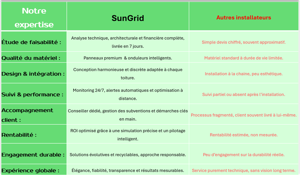 Un expert SunGrid vous suit de l’étude à la mise en service. Aucun sous-traitant aléatoire : un interlocuteur unique, un résultat maîtrisé.